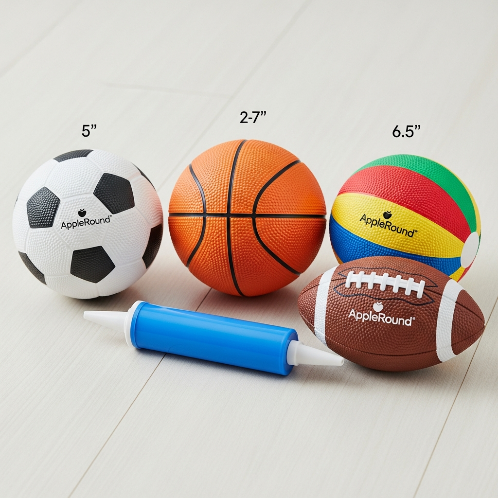 The AppleRound 4-Pack Sports Balls set represents a comprehensive introductory sports equipment collection designed for toddlers and young children ages 2-8, featuring four miniature sports balls covering major ball sports categories. The set includes one 5-inch diameter soccer ball, one 5-inch basketball, one 5-inch playground ball, and one 6.5-inch football, plus one ball pump with needle adapter for inflation. This variety pack approach enables children to explore multiple sports activities with single purchase, promoting diverse motor skill development across different ball-handling techniques at affordable price point typically ranging $15-25.